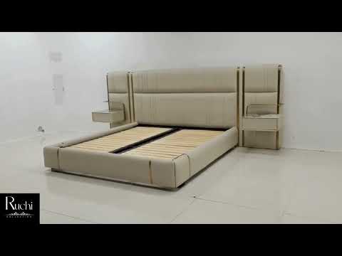 This modern leather platform bed with headboard features leather upholstery and a gold metal-plated wooden frame. The bed has an accented headboard with two LED light night stands attached to it which makes this bed stylish as well as practical upholstered in quality leather and gold plated decoration making the entire platform bed look luxurious. The solid wooden structure and hard metallic legs provides strength and durability.